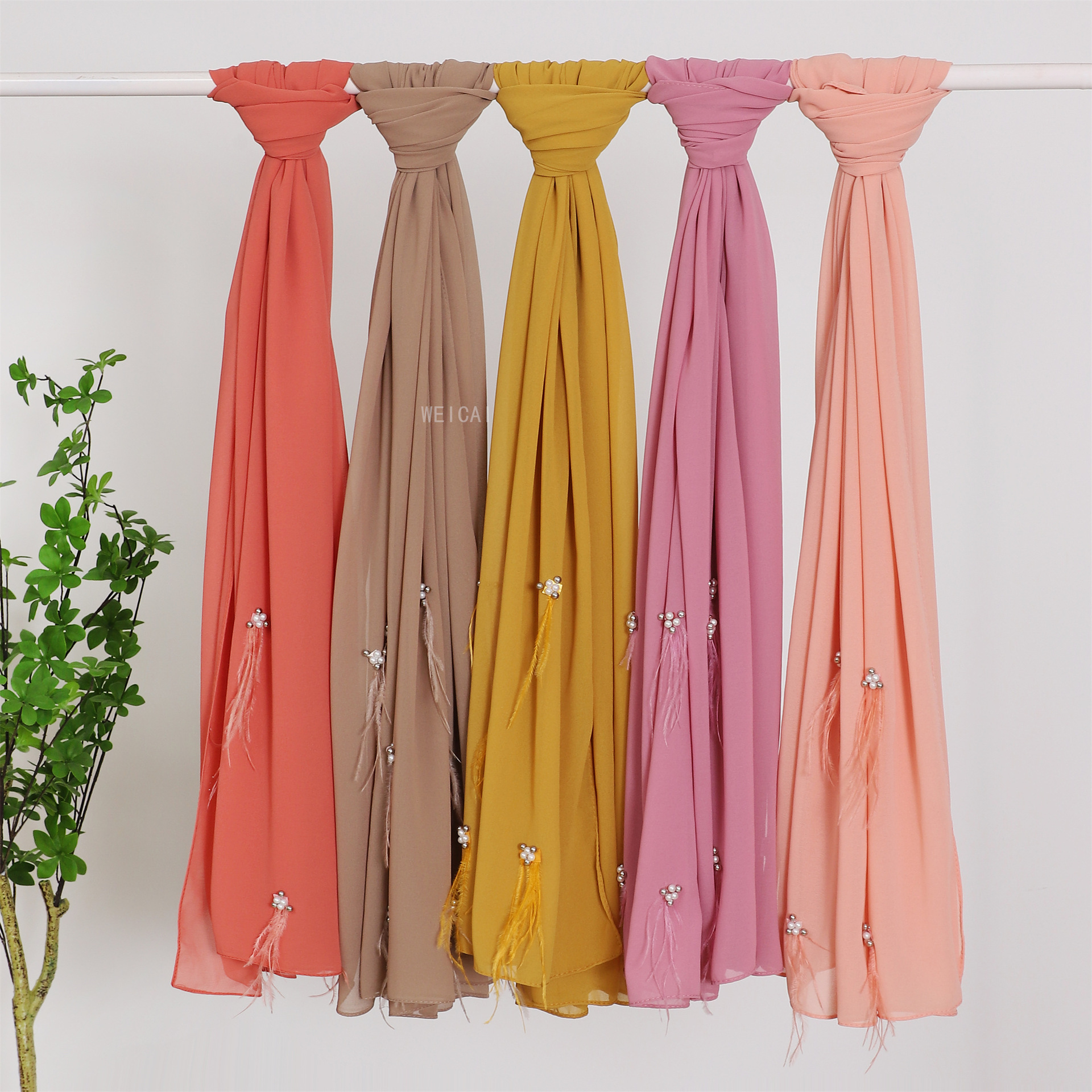 Crafted with meticulous attention to detail, each turban hijab is adorned with intricate beadwork and embellished with genuine ostrich feathers, lending a touch of luxury to your ensemble. The lightweight chiffon fabric ensures a comfortable fit, while the stunning pearl accents add a touch of sophistication.